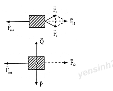Vật nặng \(m = 2,5kg\) chuyển động thẳng đều trên mặt phẳng ngang nhờ hai dây kéo nằm trong