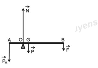 Một thanh AB nặng 30kg, dài 9m, trọng tâm tại G, biết BG = 6m. Trục quay tại O biết AO = 2m. Người ta phải tác dụng vào đầu B một lực F =100N. Treo vào đầu A một vật để thanh nằm cân bằng. Độ lớn của lực tác dụng vào O có giá trị là bao nhiêu? Lấy \(g = 10m/{s^2}\)