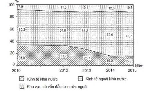 Theo biểu đồ, nhận xét nào sau đây đúng về sự thay đổi tỉ trọng trong cơ cấu doanh thu dịch vụ lữ hành phân theo thành phần kinh tế của nước ta, giai đoạn 2010 - 2015?