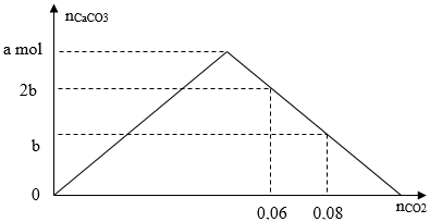 Xét tại nCO2 = 0,08 (mol), kết tủa CaCO3 đạt cực đại rồi hòa tan 1 lượng còn lại là 0,02 mol