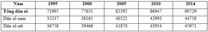 Cho bảng số liệu: DÂN SỐ TRUNG BÌNH PHÂN THEO GIỚI TÍNH CỦA NƯỚC TA, GIAI ĐOẠN 1995 - 2014