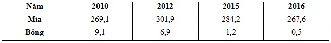 Cho bàng số liệu sau: DIỆN TÍCH MÍA, BÔNG CỦA NƯỚC TA (Đơn vị: nghìn ha) (Nguồn số liệu