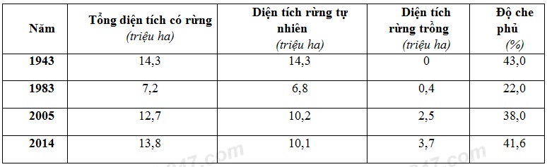 Cho bảng số liệu: DIỆN TÍCH VÀ ĐỘ CHE PHỦ RỪNG CỦA NƯỚC TA, GIAI ĐOẠN 1943 – 2014 (Nguồn: