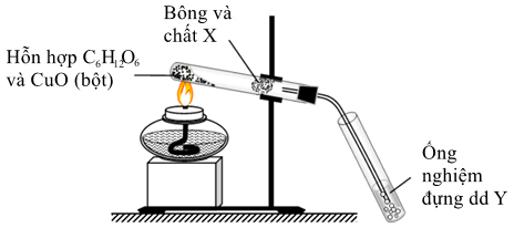 Hình bên minh họa cho thí nghiệm xác định sự có mặt của C và H trong hợp chất hữu cơ. Chất X và dung dịch Y (theo thứ tự) là