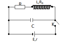 Cho mạch như hình vẽ, nguồn có suất điện động E = 24V, điện trở trong r = 1Ω, tụ điện có điện dung C = 100μF,cuộn dây có hệ số tự cảm L = 0,2H và điện trở trong Ro = 5Ω,điện trở R = 18Ω. Ban đầu khóa K đóng. Khi trạng thái trong mạch ổn định người ta ngắt khóa K. Nhiệt lượng tỏa ra trên điện trở R trong thời gian kể từ khi K ngắt đến khi dao động trong mạch tắt hẳn là