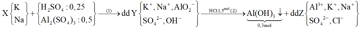 Khối lượng Na, K đã dùng có giá trị nhỏ nhất khi xảy ra hiện tượng hòa tan một phần kết tủa ở quá trình (2). Theo bảo toàn nguyên tố Al, gốc SO42- và bảo toàn điện tích trong dung dịch Z sẽ tìm được mol K, Na từ đó tính được m
