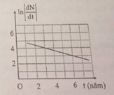Để xác định chu kì bán rã của một chất phóng xạ, một học sinh đã vẽ đồ thị liên hệ giữa \(\ln \left| {\frac{{dN}}{{dt}}} \right|\) theo t như ở hình bên. Chu kfi bán rã của chất này là