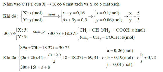 Đun nóng 0,16 mol hỗn hợp E gồm hai peptit X (CxHyOzN6) và Y (CnHmO6Nt) cần dùng 600 ml dung dịch NaOH 1,5M chỉ thu được dung dịch chứa a mol muối của Glyxin và b mol muối của Alanin. Mặt khác, đốt cháy 30,73 gam E trong O2 vừa đủ thu được hỗn hợp CO2, H2O và N2, trong đó tổng khối lượng của CO2 và nước là 69,31 gam. Giá trị a : b gần nhất với