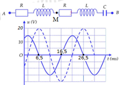 Đặt điện áp xoay chiều có giá trị hiệu dụng U vào hai đầu đoạn mạch AB như hình bên gồm hai điện trở có R = 100 Ω giống nhau, hai cuộn thuần cảm giống nhau và tụ điện có điện dung C. Sử dụng một dao động kí số, ta thu được đồ thị biểu diễn sự phụ thuộc theo thời gian của điện áp giữa hai đầu đoạn mạch AM và MB như hình bên. Giá trị của C là