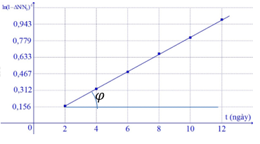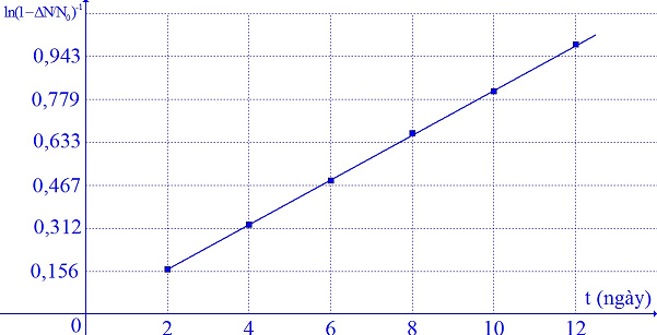 Trong phòng thí nghiệm, người ta tiến hành xác định chu kì bán rã T của một chất phóng xạ bằng cách dùng máy đếm xung để đo tỉ lệ giữa số hạt bị phân rã \(\text{ }\!\!\Delta\!\!\text{ N}\) và số hạt ban đầu \({{\text{N}}_{\text{0}}}\text{.}\) Dựa vào kết quả thực nghiệm đo được trên đồ thị hãy tính chu kì bán rã của chất phóng xạ này?
