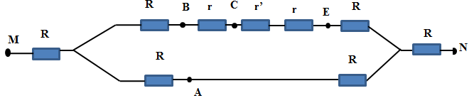 c) Mắc hai cực của nguồn vào hai điểm M và N. Tính tỉ số cường độ dòng điện qua bóng đèn sáng nhất và qua bóng đèn tối nhất