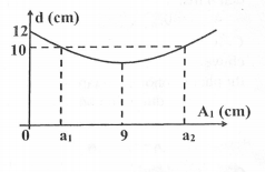 Hai chất điểm cùng khối lượng, dao động điều hòa dọc theo hai đường thắng song song kề nhau và song song với trục tọa độ Ox, có phương trình lần lượt là x1 = A1cos(ωt + φ1) và x2 = A2cos(ωt + φ2). Gọi d là khoảng cách lớn nhất giữa hai chất điểm theo phương Ox. Hình bên là đồ thị biểu diễn sự phụ thộc của d theo A1 (với A2, φ1, φ2 là các giá trị xác định). Chọn gốc thế năng tại vị trí cân bằng. Nếu W1 là tổng cơ năng của hai chất điểm ở giá trị a1 và W2 là tổng cơ năng của hai chất điểm ở giá trị a2 thì tỉ số W2/W1 gần nhất với kết quả nào sau đây?