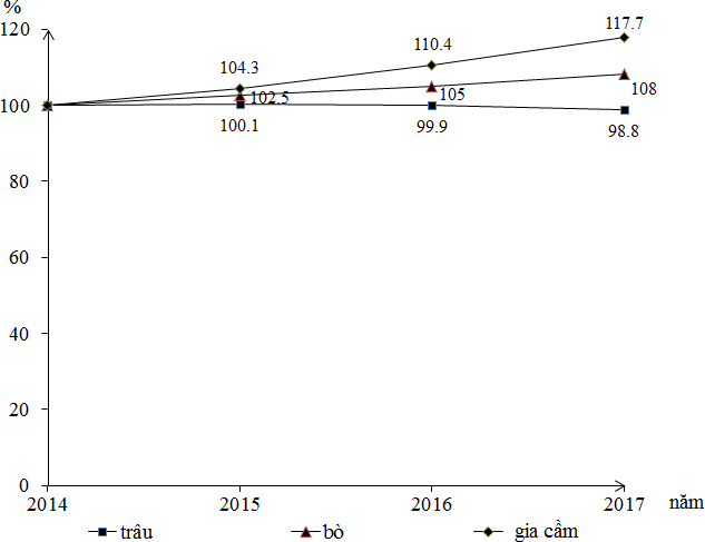 Cho biểu đồ về đàn gia súc, gia cầm nước ta giai đoạn 2014 – 2017: (Nguồn số liệu theo Niên