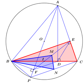 3. Gọi \(P\) là giao điểm của thứ hai của đường thẳng \(AO\) và đường tròn \(\left( O \right),\,\,M\) và \(N\) lần lượt là trung điểm của \(EF\) và \(CP.\) Tính \(\angle BMN.\)