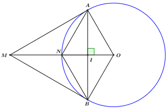 Cho đường tròn \(\left( {O;\,\,R} \right).\) Từ một điểm \(M\) ở ngoài đường tròn \(\left( {O;\,\,R} \right)\) sao cho \(OM = 2R,\) vẽ hai tiếp tuyến \(MA,\,\,MB\) với \(\left( O \right),\) (\(A,\,\,B\) là hai tiếp điểm). Lấy một điểm \(N\) tùy ý trên cung nhỏ \(AB.\) Gọi \(I,\,\,H,\,\,K\) lần lượt là hình chiếu vuông góc của \(N\) trên \(AB,\,\,AM,\,\,BM.\)