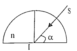 Một tia sáng SI truyền từ bán trụ thủy tinh ra không khí như hình vẽ. Biết chiết suất của không khí n2 = 1, của thủy tinh \({n_1} = \sqrt 2 ;\alpha = {60^0}\)