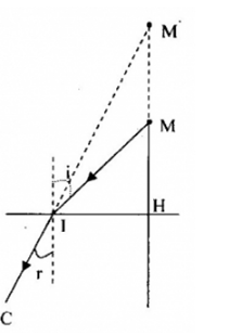 Mắt người và cá cùng cách mặt nước là 60cm, cùng nằm trên một mặt phẳng vuông góc với mặt nước. Biết chiết suất của nước là n = 4/3. Cá thấy người cách mình bao nhiêu?