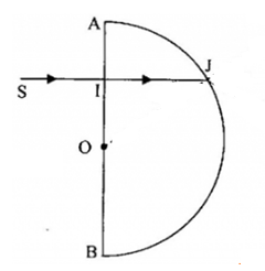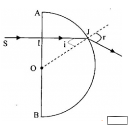 Cho một khối thủy tinh dạng bán cầu có bán kính R, chiết suất n = 1,5. Chiếu thẳng góc tới mặt phẳng của bán cầu một tia sáng SI. Biết điểm tới I cách tâm O của khối bán cầu đoạn 0,5R. Tia ló ra khỏi bán cầu lệch với phương OJ một góc bằng bao nhiêu?