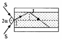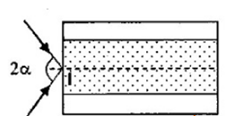 Một ống dẫn sáng hình trụ với lõi có chiết suất \({n_1} = 1,5\) và phần vỏ bọc ngoài có chiết suất\({n_2} = \sqrt 2 \). Chùm tia tới hội tụ tại mặt trước của ống tại điểm I với góc \(2\alpha \). Xác định \(\alpha \) nhỏ nhất để tia sáng trong chùm đều truyền được trong ống.