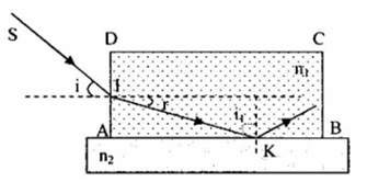 Một tấm thủy tinh mỏng, trong suốt, chiết suất \({n_1} = 1,5\)có tiết diện là hình chữ nhật ABCD (AB rất lớn so với AD) mặt đáy AB tiếp xúc với một chất lỏng có chiết suất \({n_2} = \sqrt 2 \). Chiếu tia sáng SI nằm trong mặt phẳng ABCD tới mặt AD sao cho tia tới nằm phía trên pháp tuyến ở điểm tới và tia khúc xạ trong thủy tinh gặp đáy AB ở điểm K. Giá trị lớn nhất của góc tới i để có phản xạ toàn phần tại K.