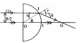 Một khối thủy tinh hình bán cầu tâm O bán kính R, chiết suất \(n = \sqrt 2 \) đặt trong không khí. Chiếu một chùm tia sáng song song, rộng vào toàn bộ mặt phẳng của bán cầu và vuông góc với mặt phẳng đó.