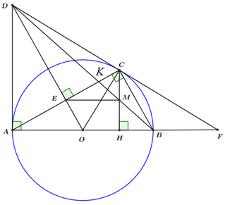 Cho đường tròn tâm \(O\) đường kính \(AB.\) Trên đường tròn \(\left( O \right)\) lấy điểm \(C\) không trùng \(B\) sao cho \(AC > BC.\) Các tiếp tuyến của đường tròn \(\left( O \right)\) tại \(A\) và tại\(C\) cắt nhau tại \(D.\) Gọi \(H\) là hình chiếu vuông góc của \(C\) trên \(AB,\,\,\,E\) là giao điểm của hai đường thẳng \(OD\) và \(AC.\)