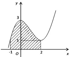 Tính diện tích \(S\) của miền hình phẳng giới hạn bởi đồ thị của hàm số \(f(x) = a{x^3} + b{x^2} + c,\) các đường thẳng \(x = - 1,\;x = 2\) và trục hoành (miền gạch chéo cho trong hình vẽ).
