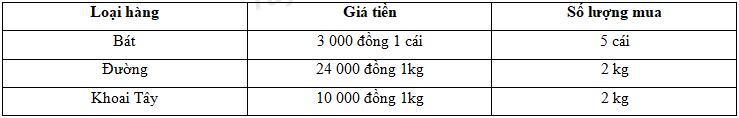 b) Tính số tiền mua đường và mua khoai tây rồi cộng với số tiền mua bát để tìm tổng số tiền mua các loại hàng.