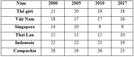 Cho bảng số liệu: TI SUẤT SINH THÔ CỦA MỘT SỐ QUỐC GIA ĐÔNG NAM Á VÀ THẾ GIỚI QUA CÁC NĂM