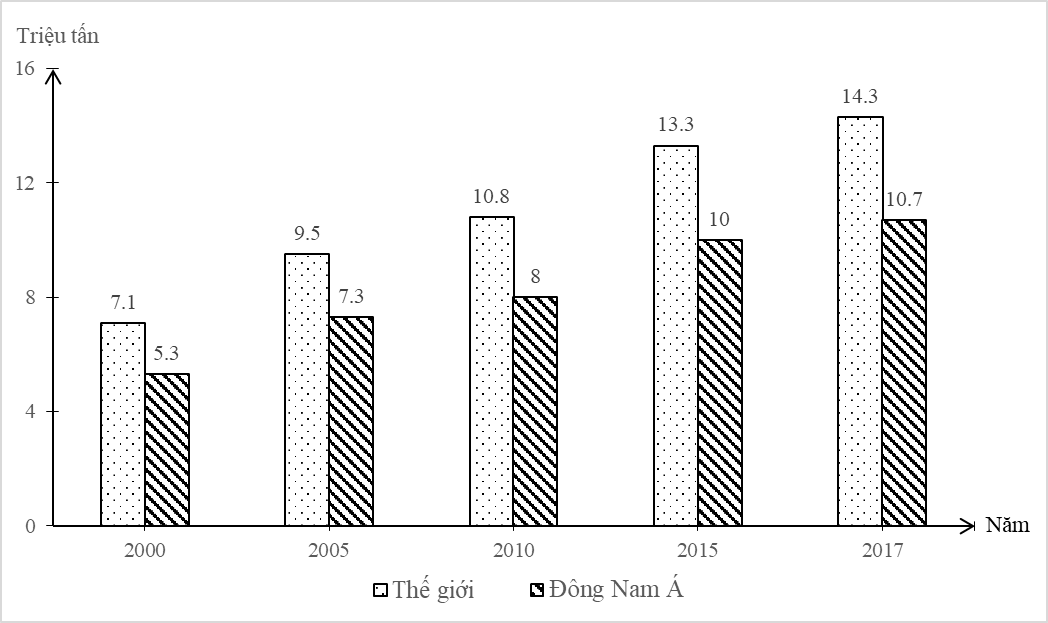 Cho biểu đồ sau đây: SẢN LƯỢNG CAO SU CỦA THẾ GIỚI VÀ ĐÔNG NAM Á QUA CÁC NĂM (Nguồn: