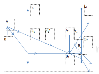 Hai thấu kính được ghép đồng trục, thấu kính \({L_1}\) có tiêu cự \({f_1} = {\rm{ }}10{\rm{ }}cm\), thấu kính \({L_2}\) có tiêu cự \({f_2} = - {\rm{ }}10{\rm{ }}cm\). Khoảng cách giữa hai kính là \(a{\rm{ }} = {\rm{ }}40{\rm{ }}cm\). Phía ngoài hệ, trước \({L_1}\) có vật sáng AB vuông góc với trục chính hệ thấu kính tại A, cách \({L_1}\) \(15{\rm{ }}cm\). Ảnh cuối cùng qua hệ là