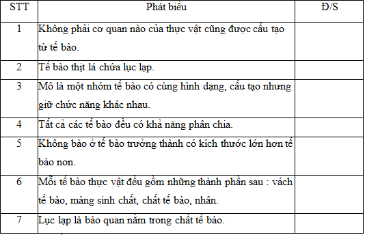 Hãy xác định những phát biểu dưới đây là đúng (Đ) hay sai (S) rồi ghi vào ô trống.