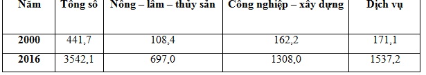 Theo bảng số liệu, trong giai đoạn 2000 – 2016 tỉ trọng GDP của khu vực dịch vụ tăng