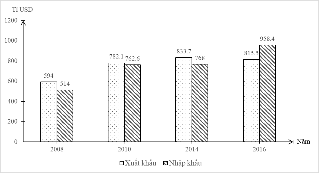 Cho biểu đồ: GIÁ TRỊ XUẤT KHẨU VÀ NHẬP KHẨU CỦA NHẬT BẢN GIAI ĐOẠN 2008 - 2016 (Nguồn số