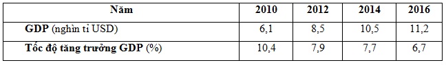 Cho bảng số liệu: GDP VÀ TỐC ĐỘ TĂNG TRƯỞNG GDP CỦA TRUNG QUỐC, GIAI ĐOẠN 2010-2016 (Nguồn
