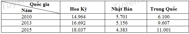 Cho bảng số liệu sau: TỔNG SẢN PHẨM TRONG NƯỚC CỦA MỘT SỐ QUỐC GIA GIAI ĐOẠN 2010 – 2015. (