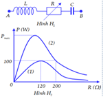 Cho đoạn mạch AB như hình H1 với L là cuộn cảm thuần, R là biến trở. Đặt vào hai đầu đoạn mạch điện áp xoay chiều có biểu thức u = \(U\sqrt{2}cos2\pi ft\)(V), U không đổi nhưng f có thể thay đổi được. Hình H2 là đồ thị biểu diễn sự phụ thuộc của công suất tiêu thụ điện của mạch theo R là đường (1) khi f = f1 và là đường (2) khi f = f2. Bỏ qua điện trở của dây nối. Giá trị của Pmax gần nhất với giá trị nào sau đây ?