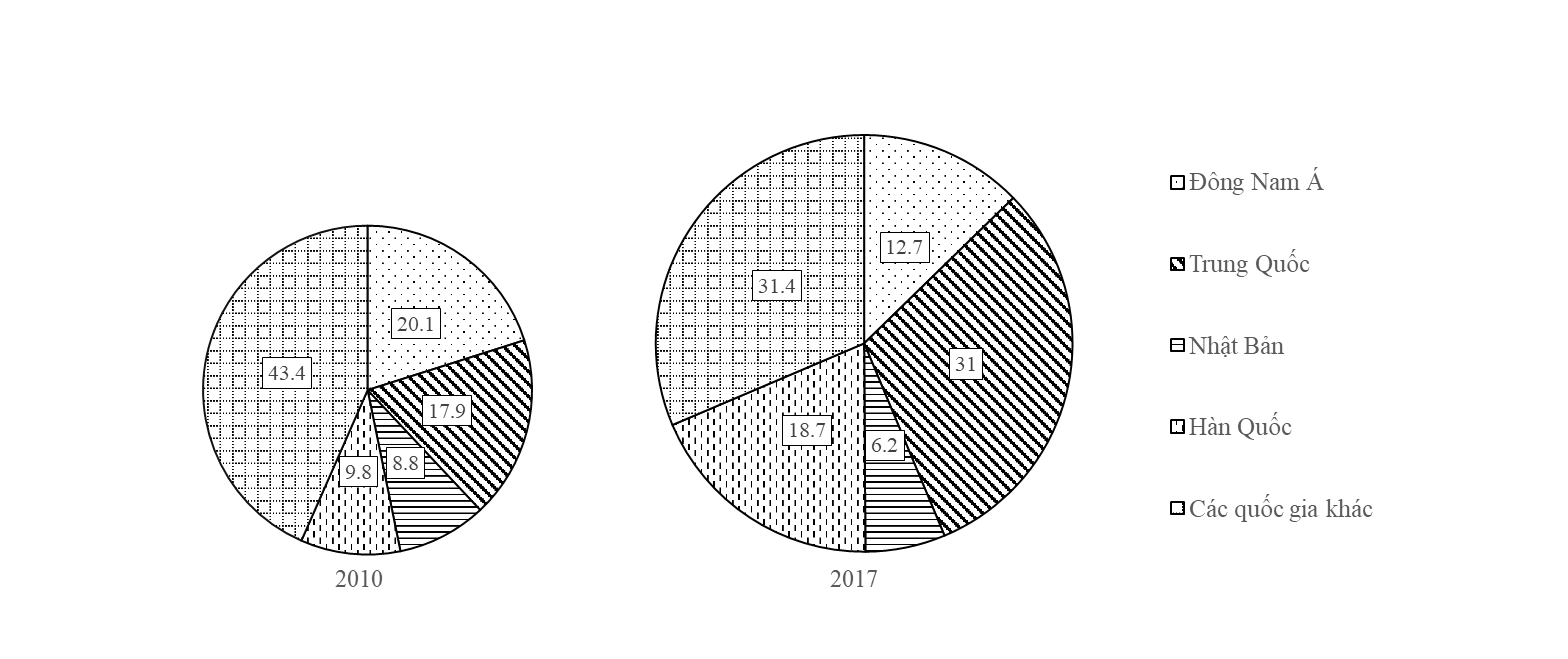 Theo biểu đồ, nhận xét nào sau đây đúng về sự thay đổi tỉ trọng trong cơ cấu khách du lịch quốc tế đến Việt Nam phân theo khu vực, quốc gia năm 2017 so với năm 2010?