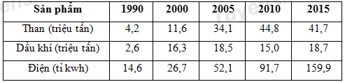 Cho bảng số liệu sau: SẢN LƯỢNG MỘT SỐ NGÀNH CÔNG NGHIỆP NƯỚC TA, GIAI ĐOẠN 1990 –