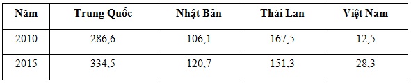 Cho bảng số liệu: TỔNG DỰ TRỮ QUỐC TẾ CỦA MỘT SỐ QUỐC GIA, NĂM 2010 VÀ 2015 (Đơn vị: Tỷ