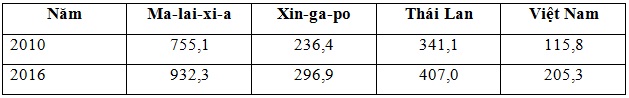 Theo bảng số liệu, nhận xét nào sau đây đúng khi so sánh về tổng sản phẩm trong nước của một số quốc gia, năm 2016 so với 2010?