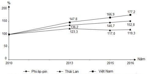 Cho biểu đồ về GDP của Phi-lip-pin, Thái Lan và Việt Nam, giai đoạn 2010 – 2016 (Nguồn: xử lí