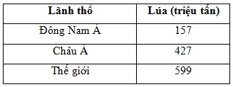 Dựa vào bảng số liệu “sản lượng lúa năm 2000”, cho thấy sản lượng lúa ở Đông Nam Á chiếm tỉ lệ cao so với thế giới là:
