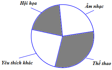 Trường A tiến hành khảo sát 1500 học sinh về sự yêu thích hội họa, thể thao, âm nhạc và các yêu thích khác. Mỗi học sinh chỉ chọn một yêu thích. Biết số học sinh yêu thích hội họa chiếm tỉ lệ 20% so với số học sinh toàn trường.