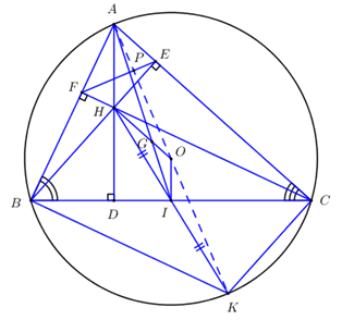 b) Gọi \(I\) là trung điểm của cạnh \(BC,\,\,K\) là điểm đối xứng của \(H\) qua \(I\). Chứng minh ba điểm \(A,\,\,O,\,\,K\) thẳng hàng.