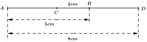 Trên một đường thẳng cho bốn điểm \(A,\,\,B,\,\,C,\,\,D\) sao cho \(C\) nằm giữa \(A\) và \(B,\,\,B\) nằm giữa \(C\) và \(D.\) Cho biết \(AB = 5cm,\,\,AD = 8cm,\,\,BC = 2cm.\)