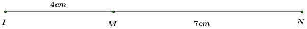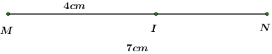 Cho đoạn thẳng \(MN = 7cm.\) Lấy điểm \(I\) thuộc đường thẳng \(MN\) sao cho \(MI = 4cm.\) Tính