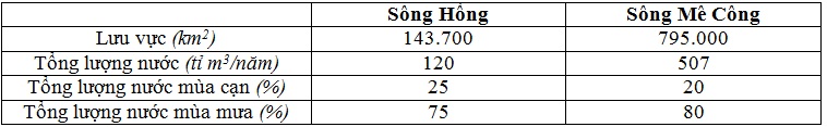 Cho bảng số liệu: LƯU VỰC VÀ TỔNG LƯỢNG NƯỚC SÔNG HỒNG VÀ SÔNG MÊ CÔNG (Nguồn: Niên giám