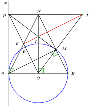 c) Biết đường thẳng vuông góc với \(AB\) tại \(O\) cắt \(BM\) tại\(N,\,\,AN\) cắt \(OP\) tại \(K,\,\,PM\) cắt \(ON\) tại\(I,\,\,PN\) cắt \(OM\) tại \(J.\) Chứng minh \(K,\,\,I,\,\,J\) thẳng hàng.