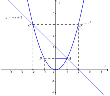 Cho parabol \(\left( P \right):y = {x^2}\) , các đường thẳng \(\left( {{d_1}} \right):y = - x + 2\) và